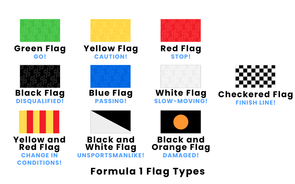 - Black and orange flags waved together means a technical issue and in the next lap the car must go in the pit stop.
